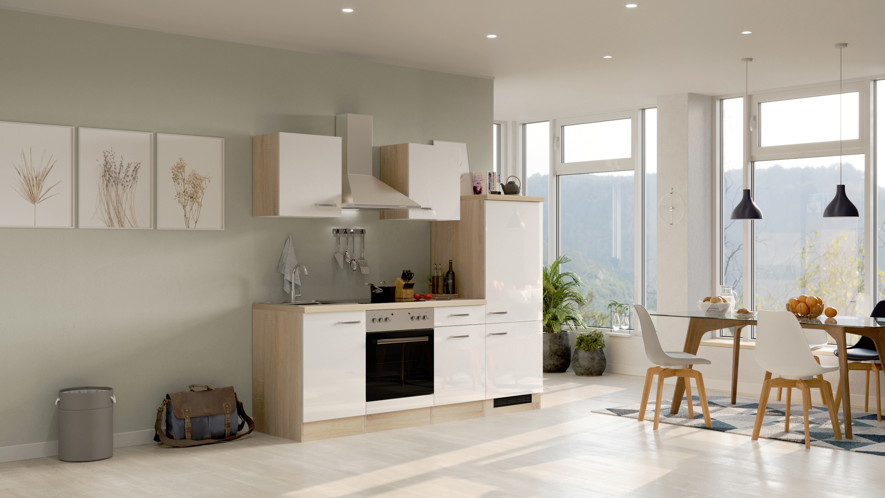 - Inklusive Dunstabzugshaube, Einbau-Kühlschrank, Herd mit Glaskeramik-Kochfeld und Einbauspüle (46 cm)
