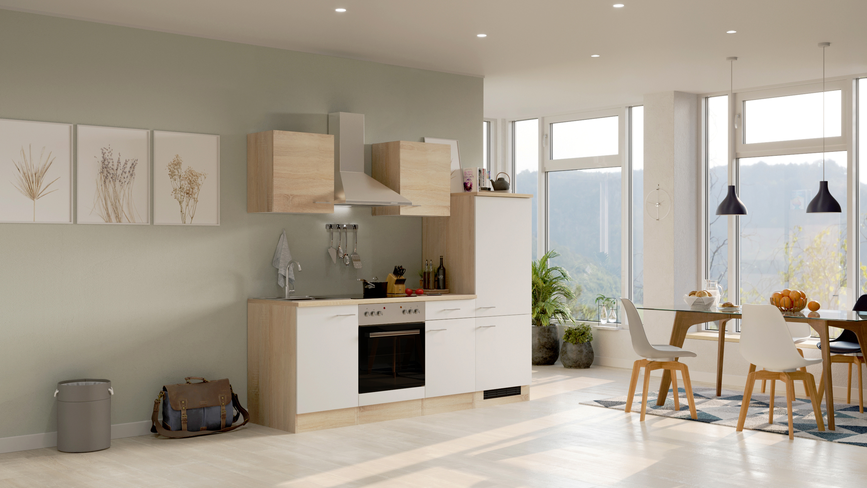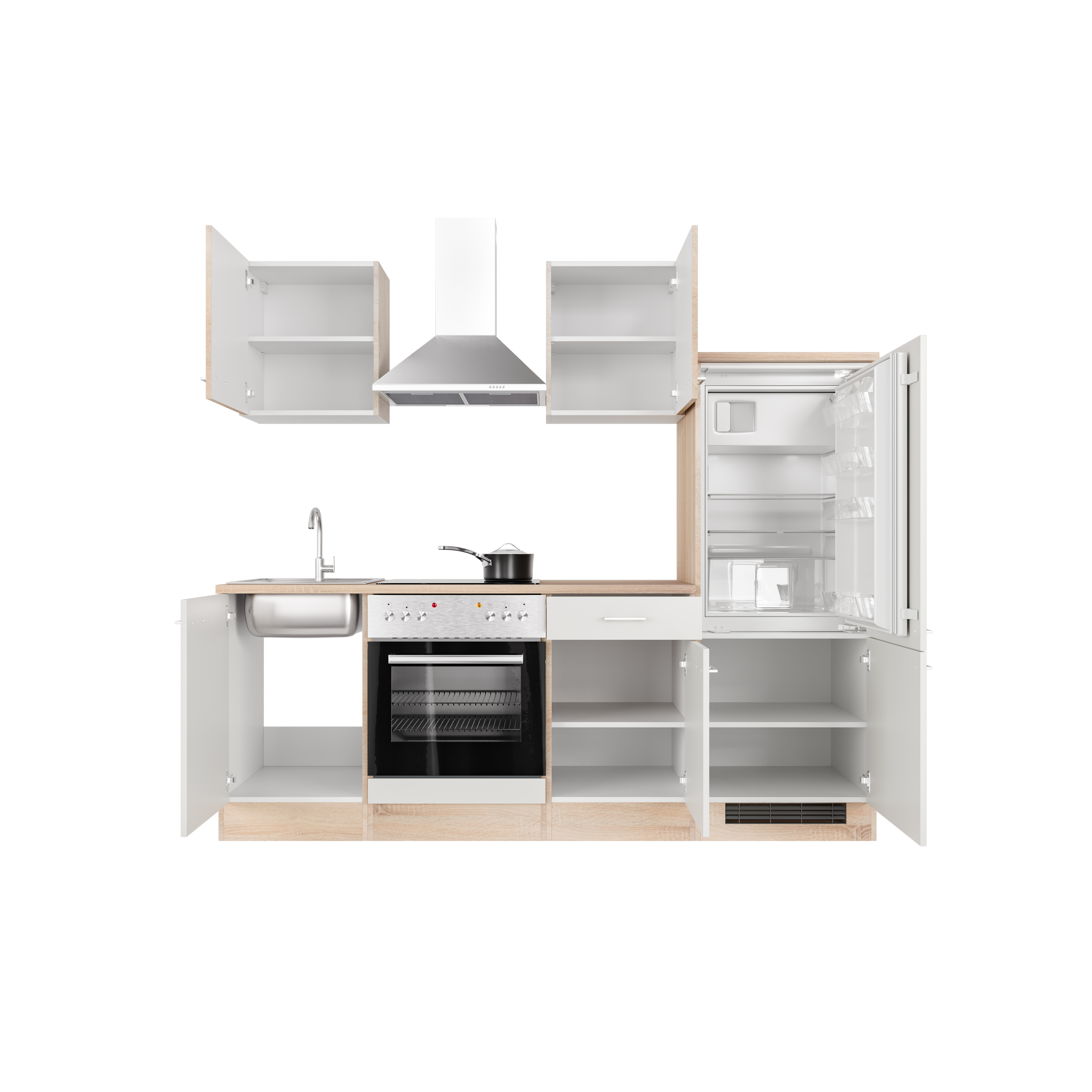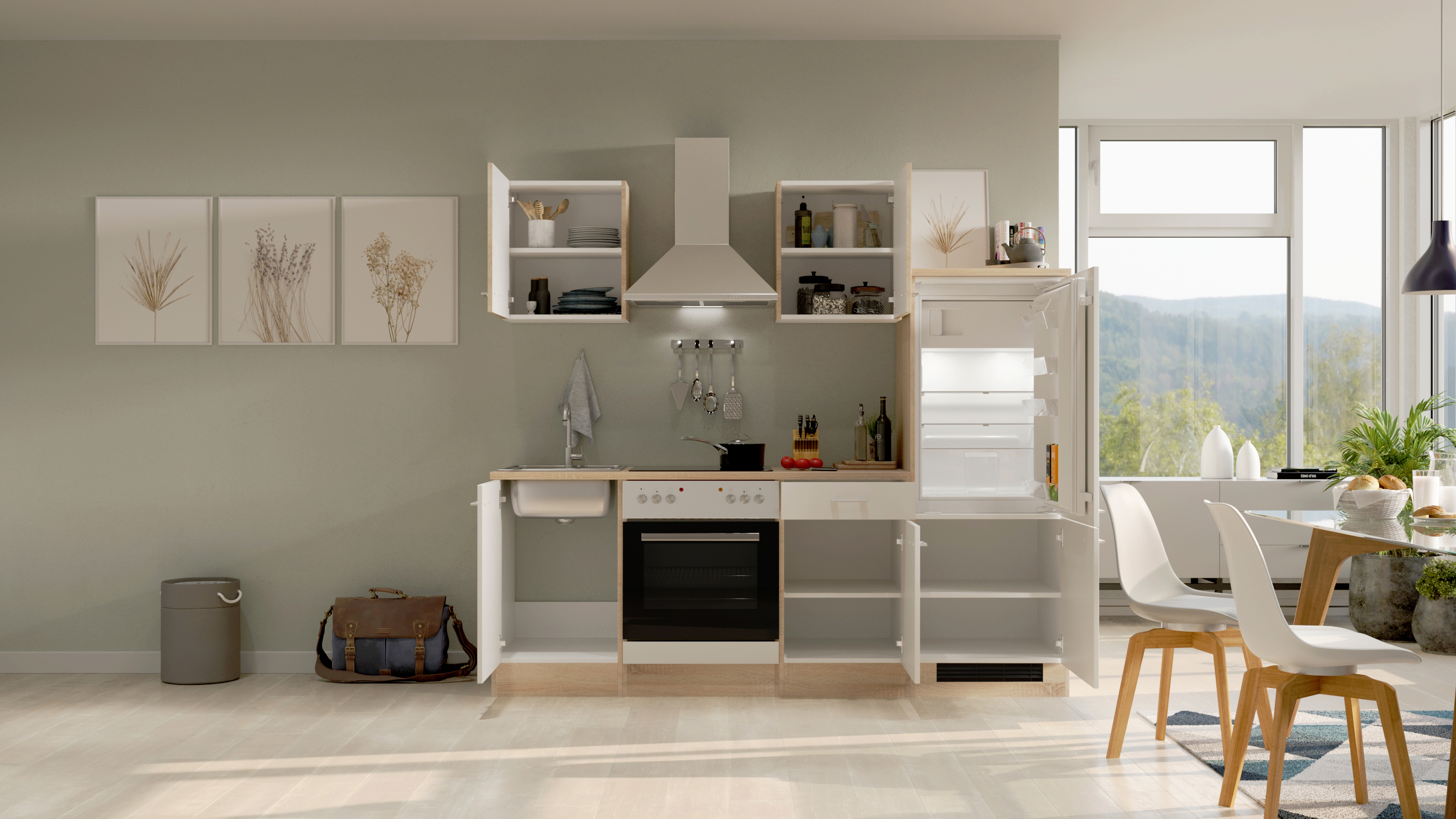 - Inklusive Dunstabzugshaube, Einbau-Kühlschrank, Herd mit Glaskeramik-Kochfeld und Einbauspüle (46 cm)