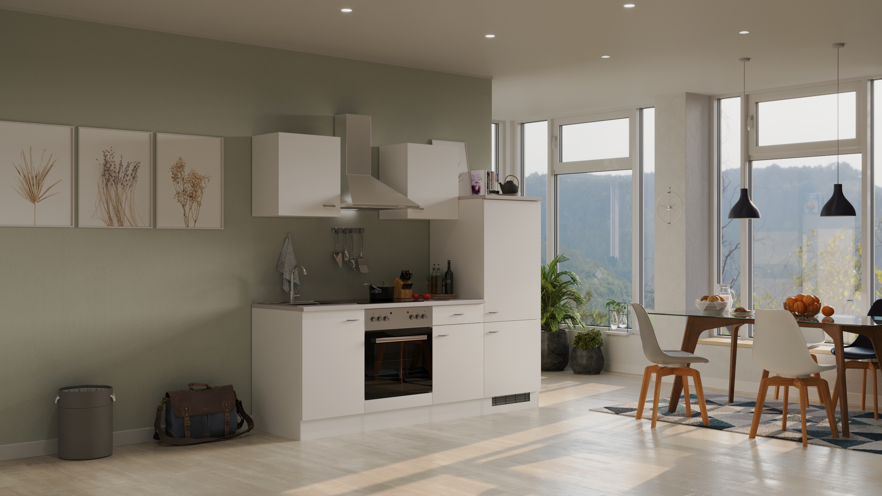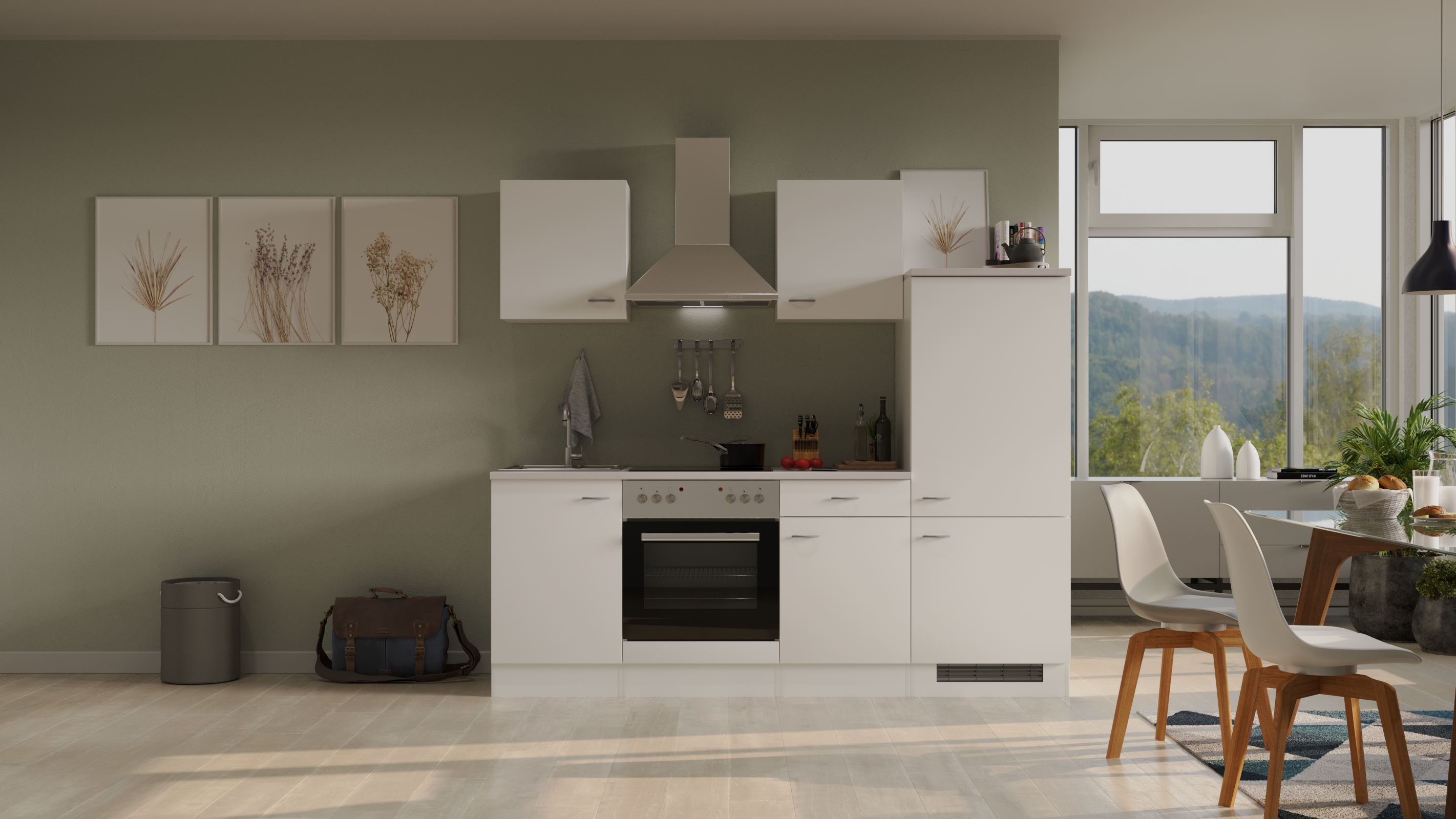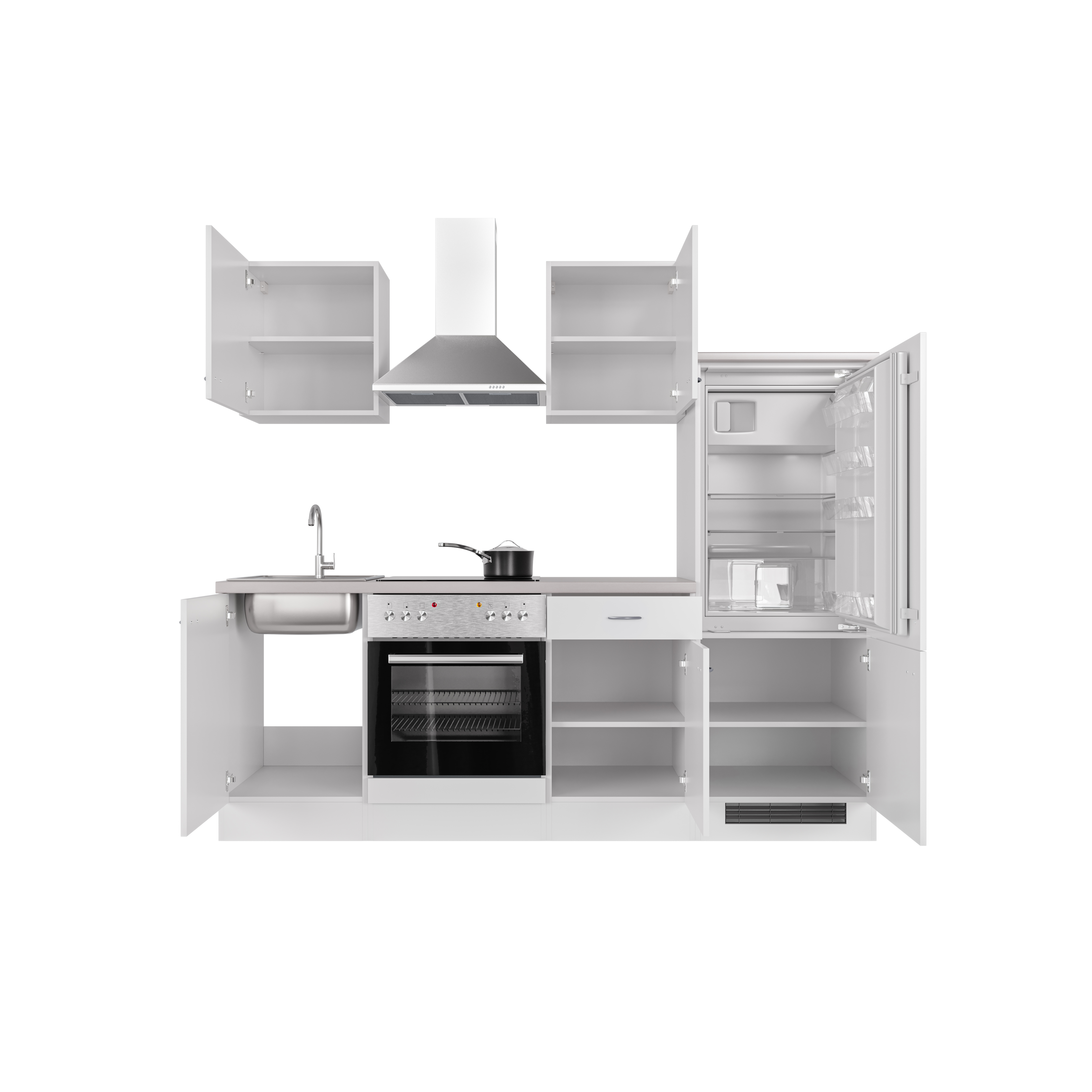 - Inklusive Einbauherd mit 4-Zonen-Glaskeramik-Kochfeld, Edelstahl-Dunstabzugshaubeund Einbau-Spüle (86 cm)