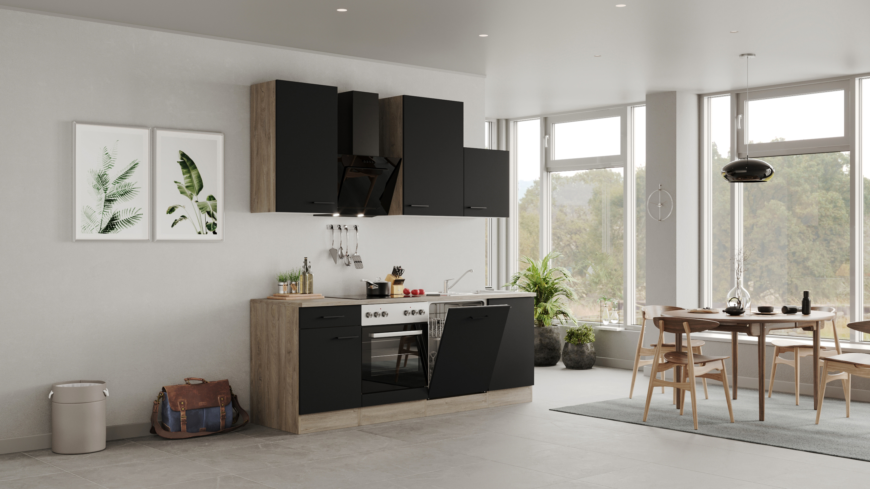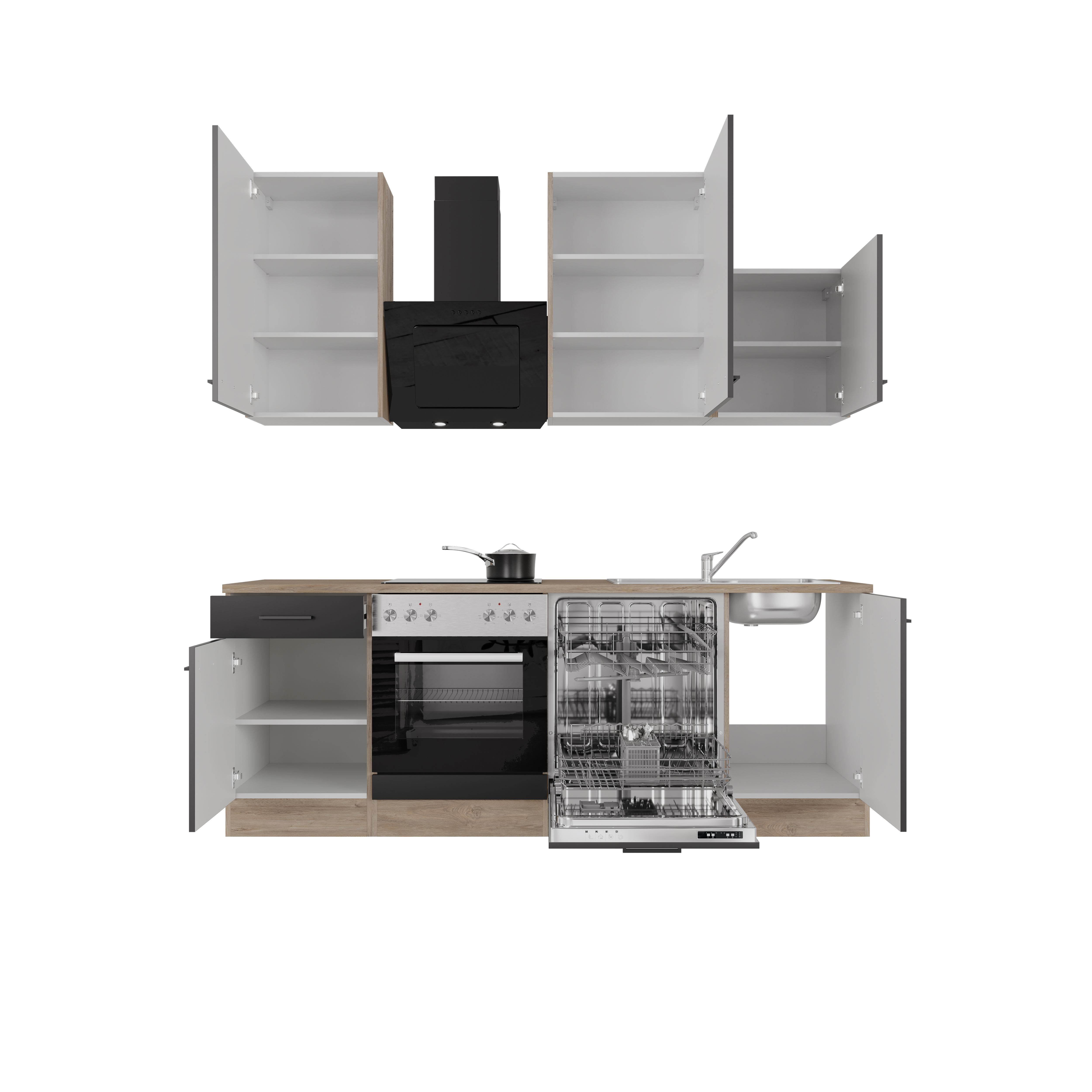 - Inklusive Einbauherd mit 4-Zonen-Glaskeramik-Kochfeld, Dunstabzugshaube, Geschirrspüler und Einbau-Spüle (86 cm)