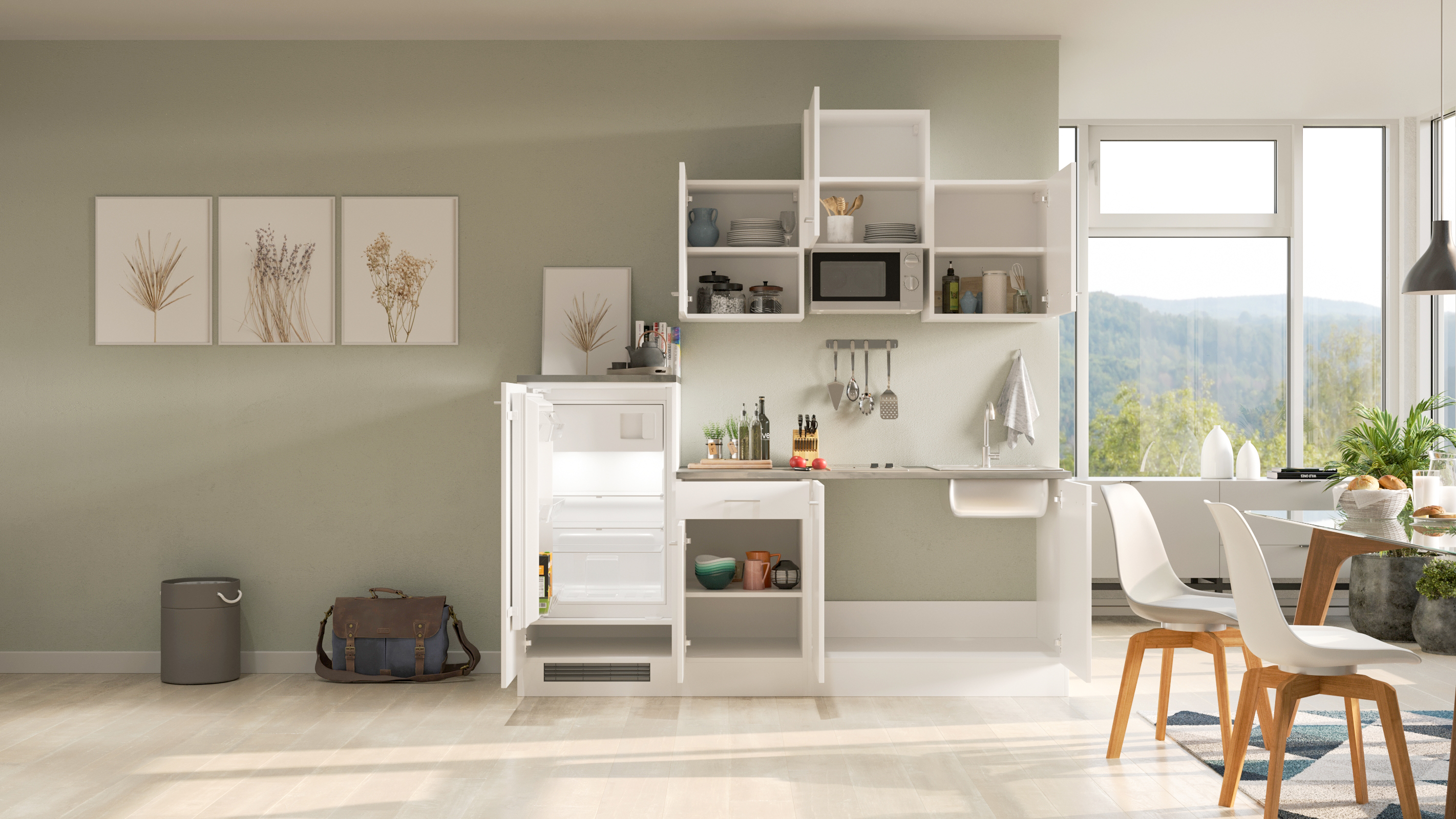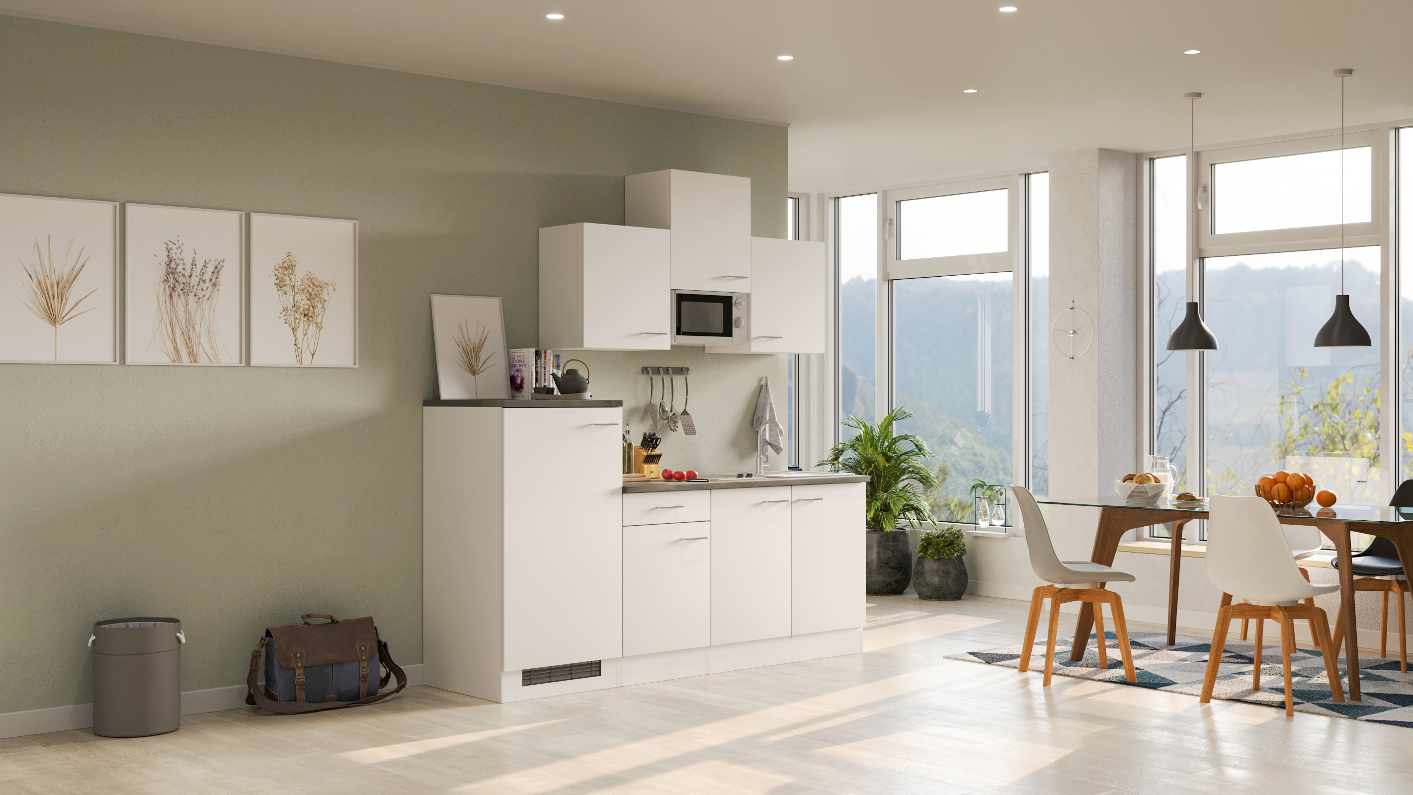 Klassische Singleküche mit 210 cm breit in Weiß. Inklusiver E-Geräte, die die Singleküche ideal für kleine Haushalte und Wohnungen machen.