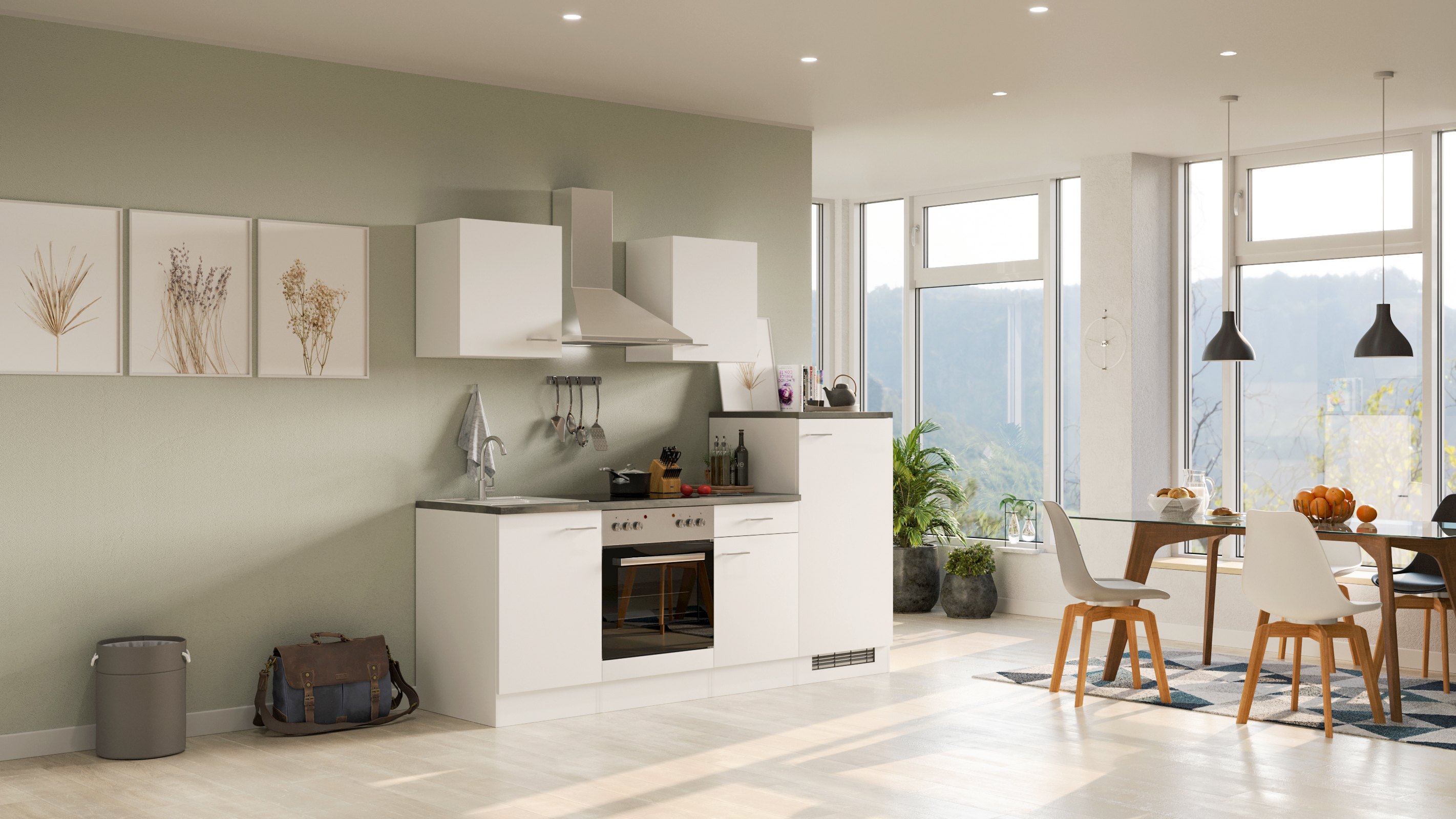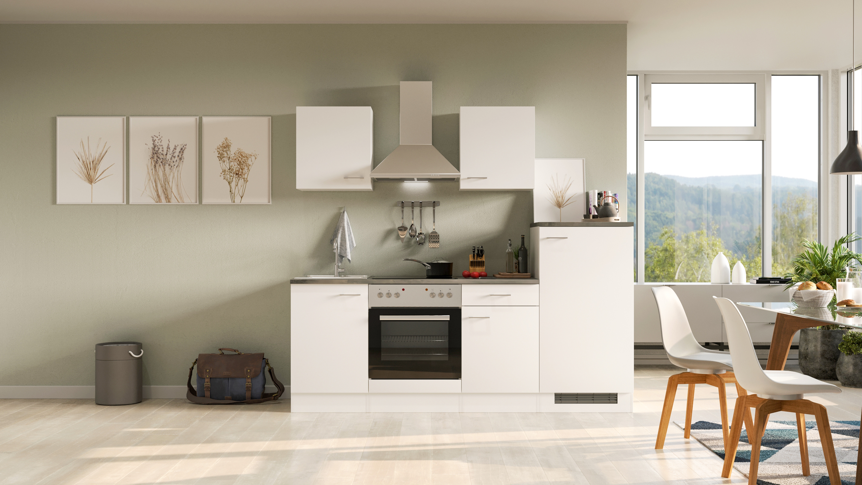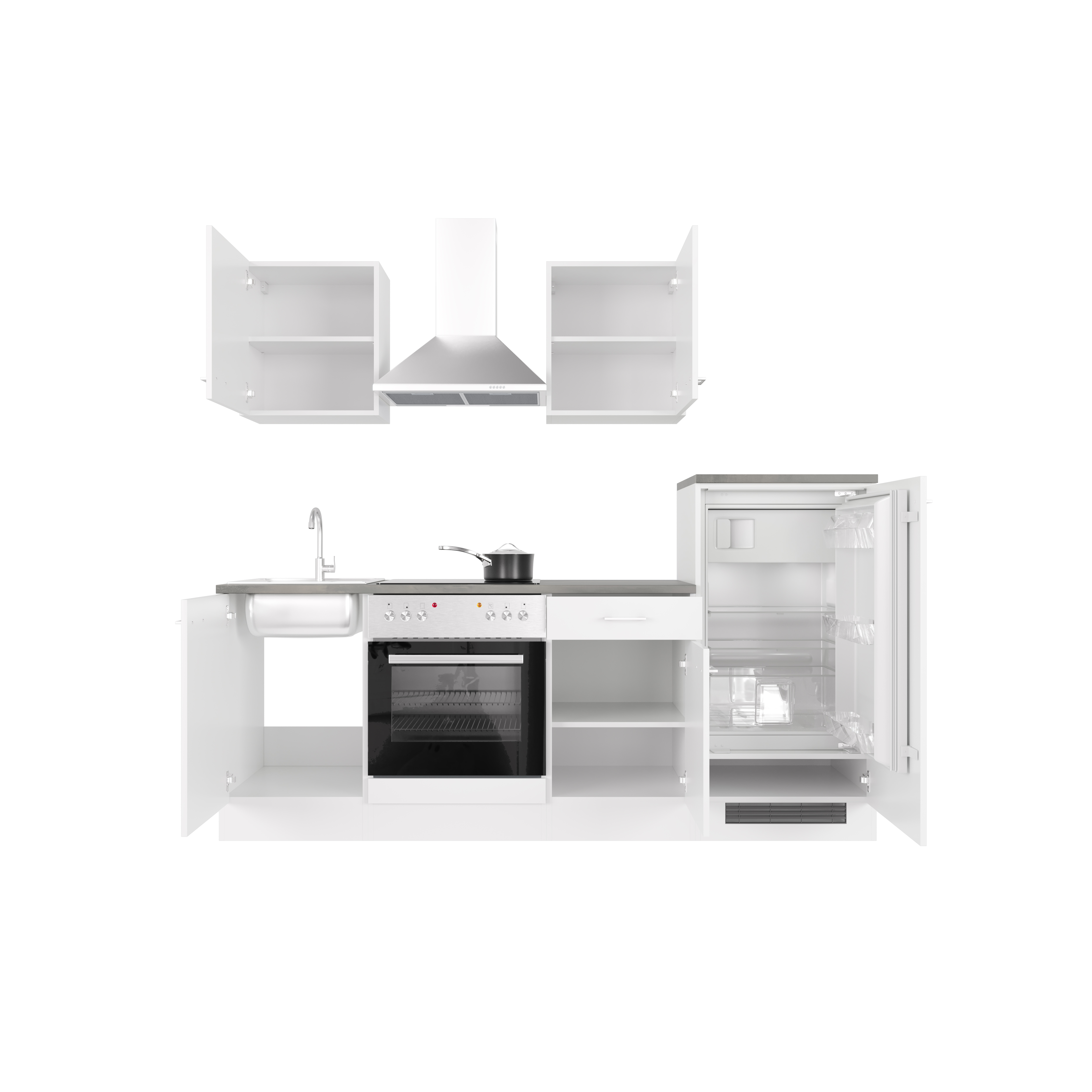 - Inklusive Dunstabzugshaube, Einbau-Kühlschrank, Herd mit Glaskeramik-Kochfeld und Einbauspüle (46 cm)